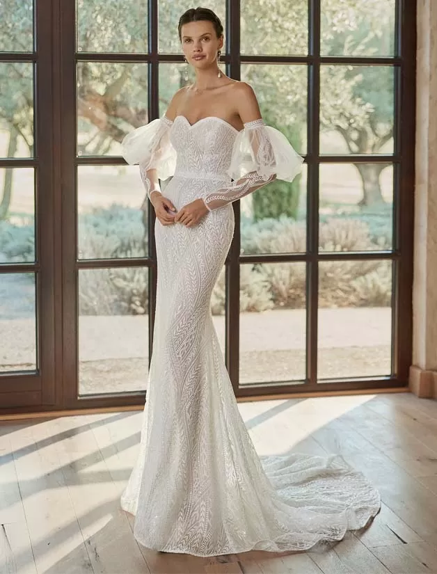 Gilian è un abito da sposa sirena senza spalline e con scollo a cuore davvero sensuale. Perfetto per una cerimonia sulla spiaggia in estate, quest’abito sorprende con la scollatura sulla schiena e i dettagli di pizzo. Include maniche rimovibili e una sopraggonna leggera.