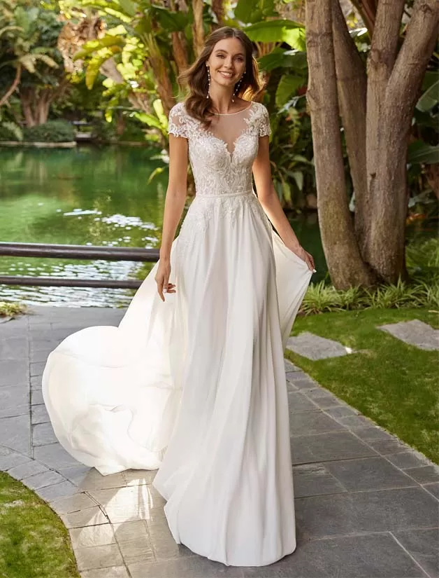 Abito da sposa stile principessa, realizzato in georgette abbinata a pizzi impreziositi da perline; con una sovrapposizione di illusione su uno scollo a cuore, una schiena effetto tatuaggio con dettaglio di bottoni e maniche corte. Delicato design Adriana Alier.