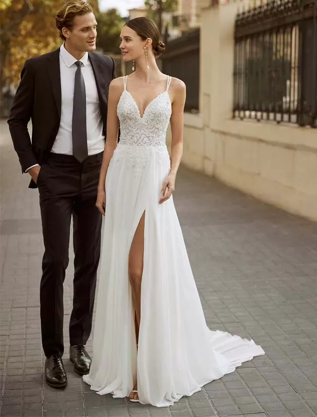 Arlette è il modello ideale per chi sogna un abito giovanile. Il comodo taglio dritto è esaltato dal corpetto ricamato e tempestato di strass, perfetto per una cerimonia religiosa in primavera. Le spalline incorniciano lo scollo a V sul davanti e l’elegante scollatura sulla schiena. Dalla vita scivola la gonna in georgette con spacco laterale.