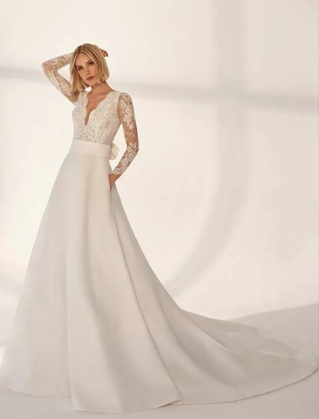 Abito da sposa con gonna redingote in stile classico, confezionato in pizzo con passamaneria a onda di strass e gonna in Amalfi; scollo a V sul davanti e sulla schiena con onde incrociate e tulle effetto illusione; ampia fusciacca in Amalfi e maniche lunghe in pizzo Abito Aire Atelier Esclusivo di alta moda.