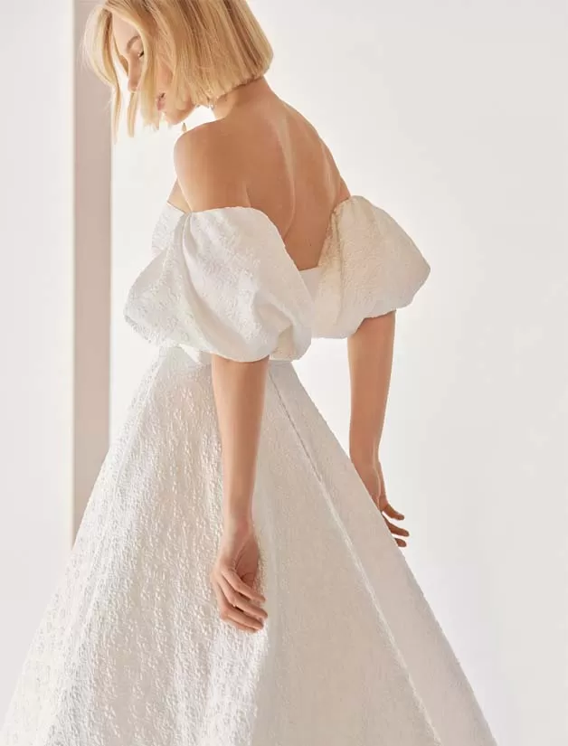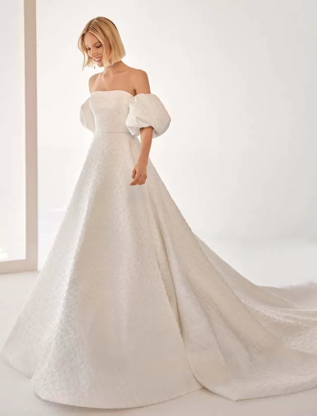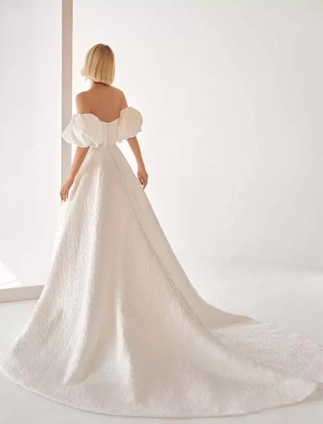 Elegante abito da sposa a mantella, realizzato in broccato rosel con corpetto senza spalline e gonna a mantella svasata; con manicotti a sbuffo rimovibili. Look di Air Atelier unico.