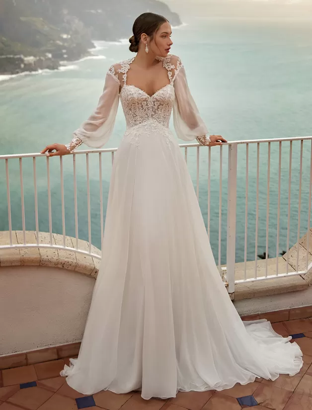 Romantico abito da sposa scivolato in raso off white e corpino di pizzo smanicato con scollo a cuore. La cappa in pizzo con maniche lunghe rende perfetto questo look per la cerimonia e la sera.