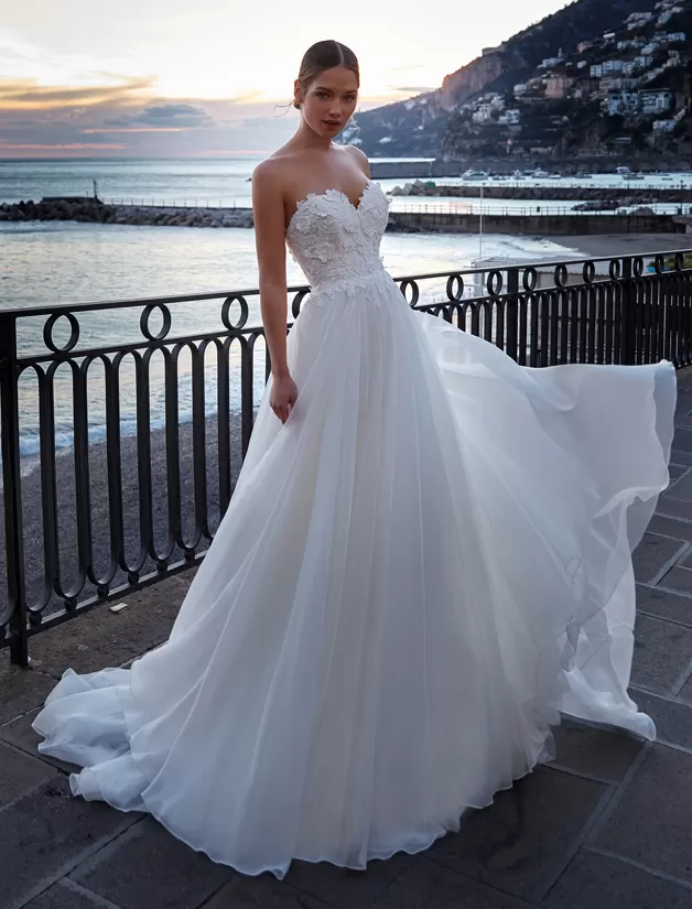 Incantevole abito da sposa scivolato in organza off white co corpino di pizzo smanicato e scollo a cuore. Il ramage è di pizzo tone sur tone è moderno e iper delicato