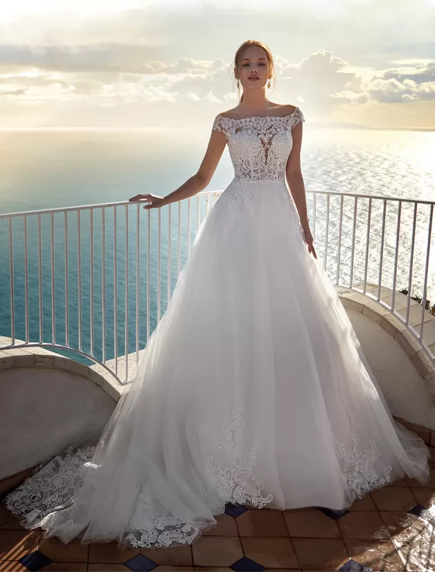 Abito da sposa romantico con gonna in tulle off white linea ad A e un delizioso corpino di pizzo con scollo a barchetta. Il dettaglio floreale sulla schiena è meraviglioso!
