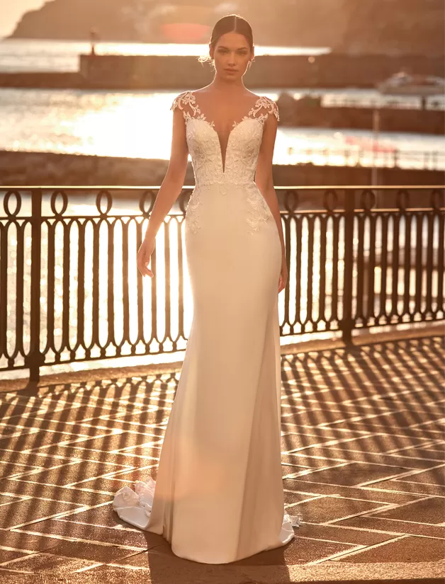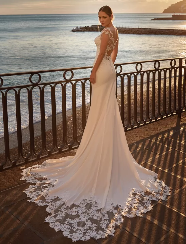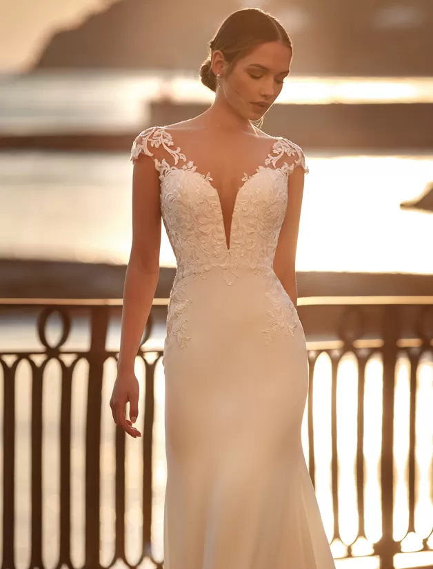 Abito da sposa a sirena seducente e moderno al tempo stesso: il crepe della gonna e del corpino incontrano intagli e applicazioni di pizzo che ti renderanno semplicemente unica!