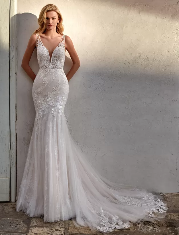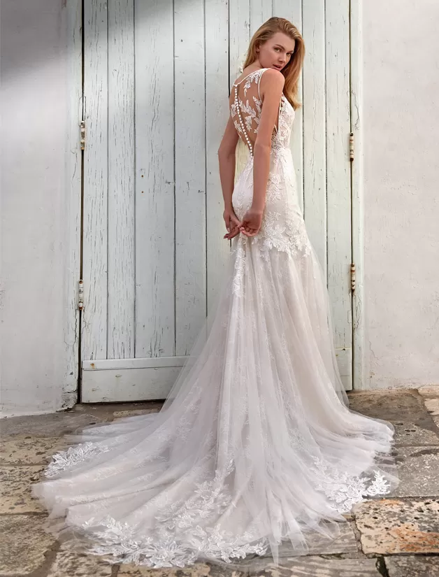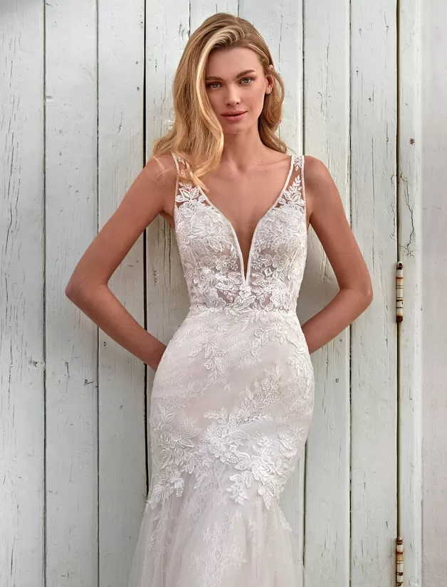 Sensuale abito da sposa a sirena in pizzo chantilly floreale. Lo scollo a V sul decolleté e l'effetto tattoo sulla schiena incorniciano la tua bellezza con eleganza.