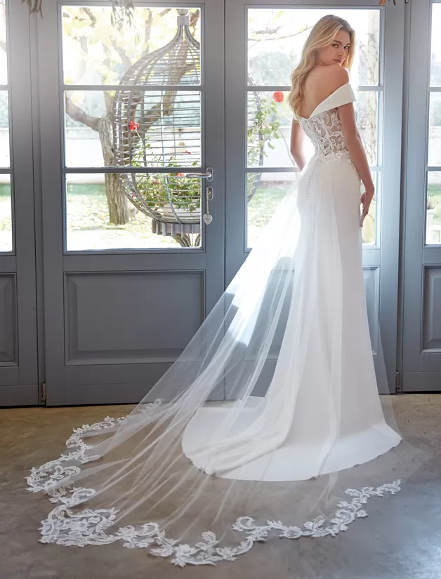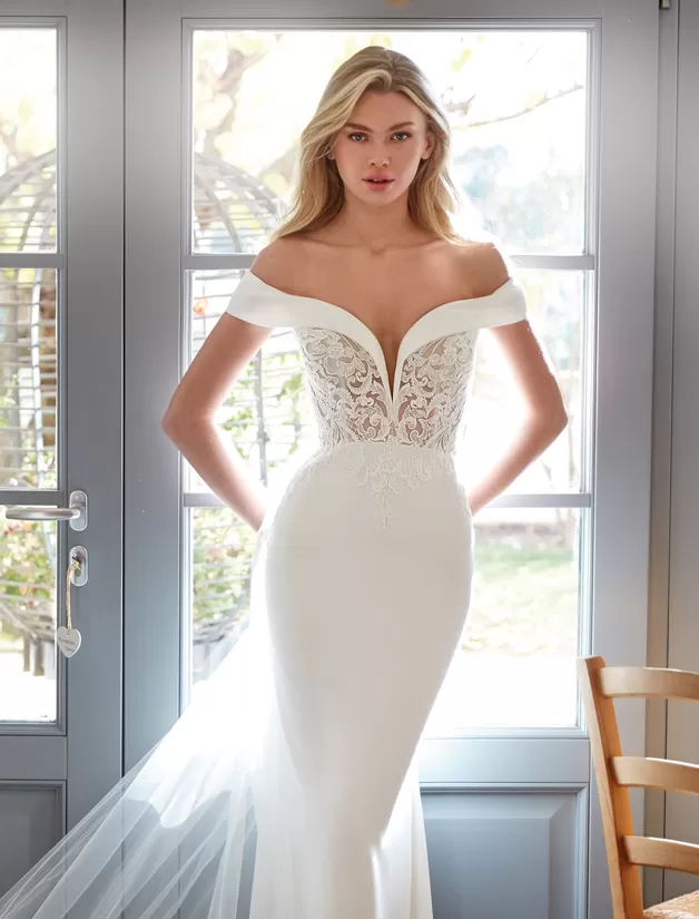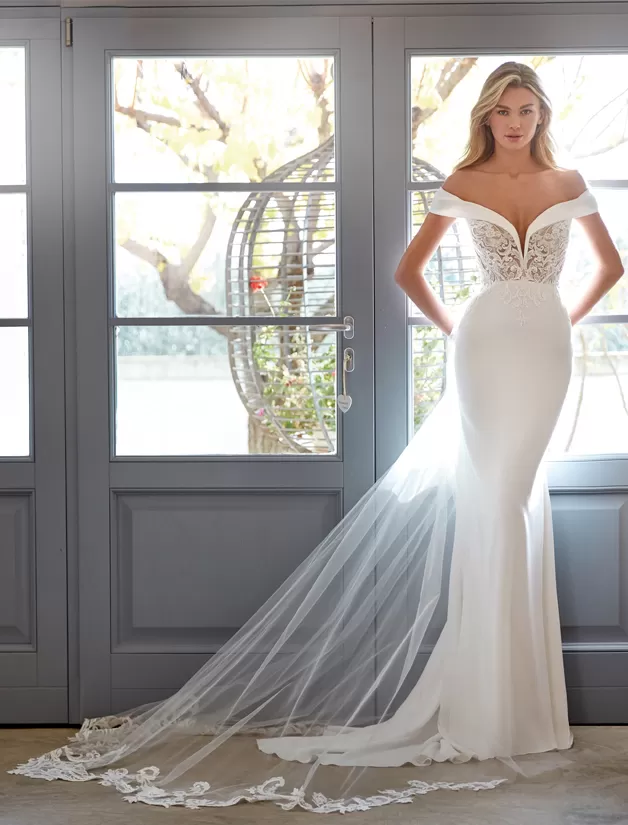 Sensuale abito da sposa a sirena ecologico, realizzato in eco crepe, con corpino di pizzo ricamato e bordi in crepe a contrasto. Semplicemente favoloso!