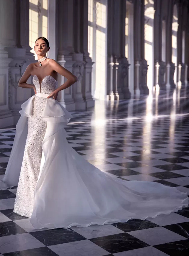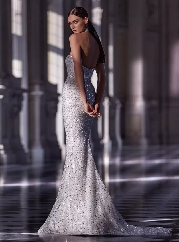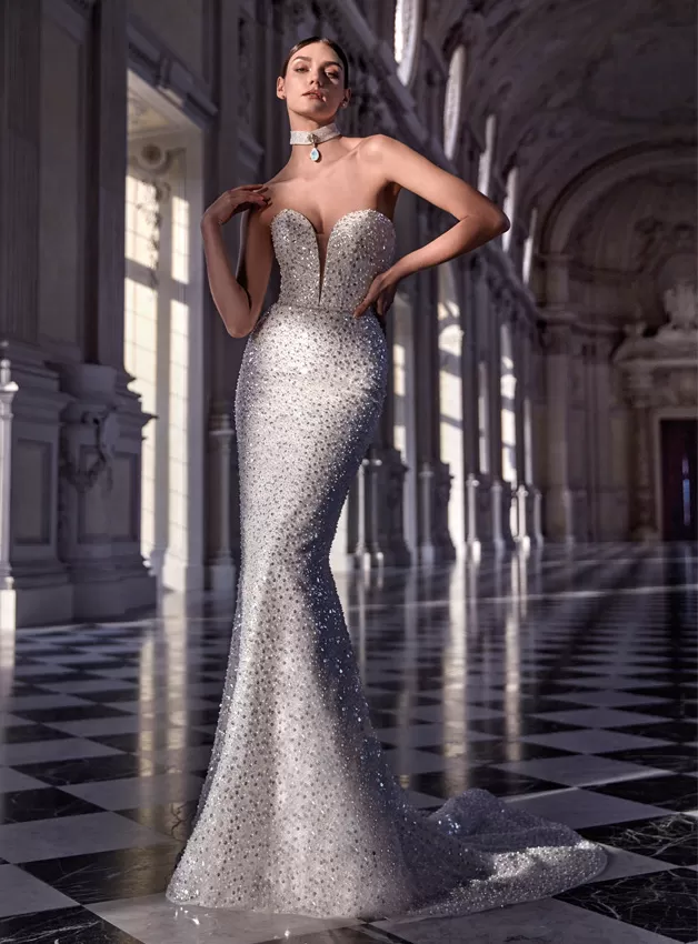Un abito stile sirena da far girare la testa, da sfilata di moda, con perline all-over per ottenere il massimo del glamour. Senza spalline, con una scollatura profonda e un corsetto di sostegno incorporato. La sua linea slanciata è perfetta per essere accessoriata con una gonna a ruota.