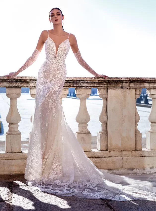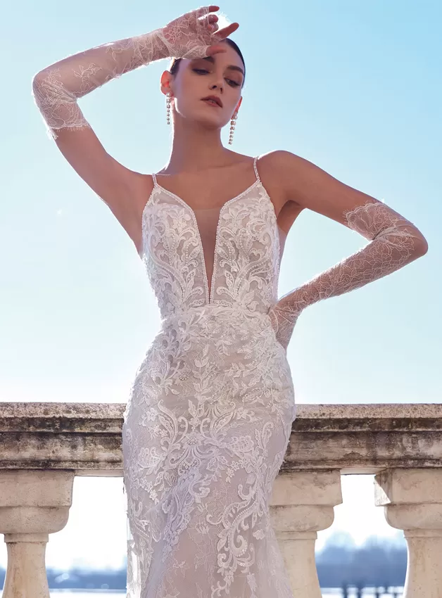 Un look in stile sirena sofisticato e sexy in pizzo all-over e applicazioni ricamate. Con sontuose perline intorno al collo e alla schiena e un incredibile strascico in tulle trasparente rifinito con applicazioni di alta qualità. Le maniche staccabili opzionali aggiungono un ulteriore tocco di glamour.