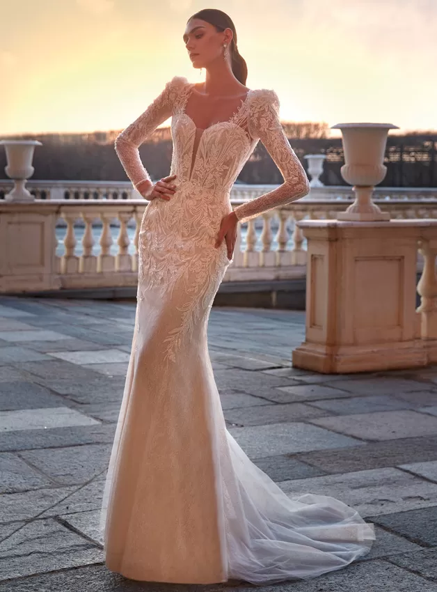 Uno spettacolare abito stile sirena che può essere trasformato in stile principessa con l'aggiunta di una sopragonna. Con ricami incredibilmente intricati sul corpetto e sulla parte superiore della gonna che definiscono i contorni del corpo. La scollatura è sostenuta da un inserto in tulle color nude e da coppe interne, mentre le spalle arricciate e le maniche lunghe aderenti creano un moderno look da sposa in stile rinascimentale.