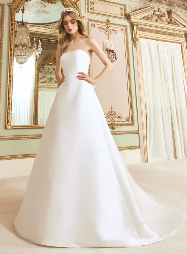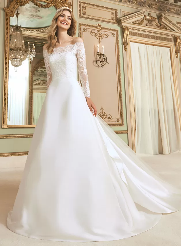Semplice e minimalista. Un disegno classico in mikado, con scollatura arrotondata e silhouette a trapezio, decorato con un grande laccio sulla schiena. Un abito che può trasformarsi con la giacca in pizzo a maniche lunghe e lo strascico in tulle ricamato.