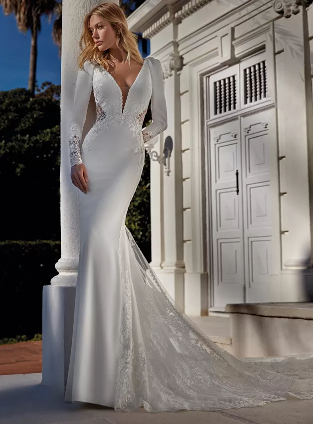 Spettacolare abito a sirena in crepe, con maniche lunghe, scollo a V, schiena semi-trasparente e corpetto con effetto cut-out. Un modello molto sensuale che gioca con il minimalismo del tessuto per abbinarlo con le applicazioni di pizzo e perline all-over fino allo strascico in tulle semitrasparente.