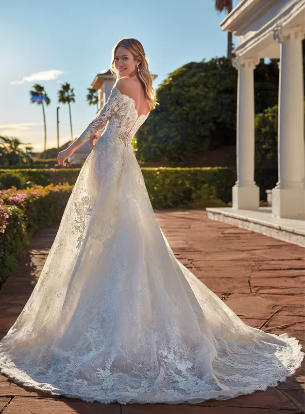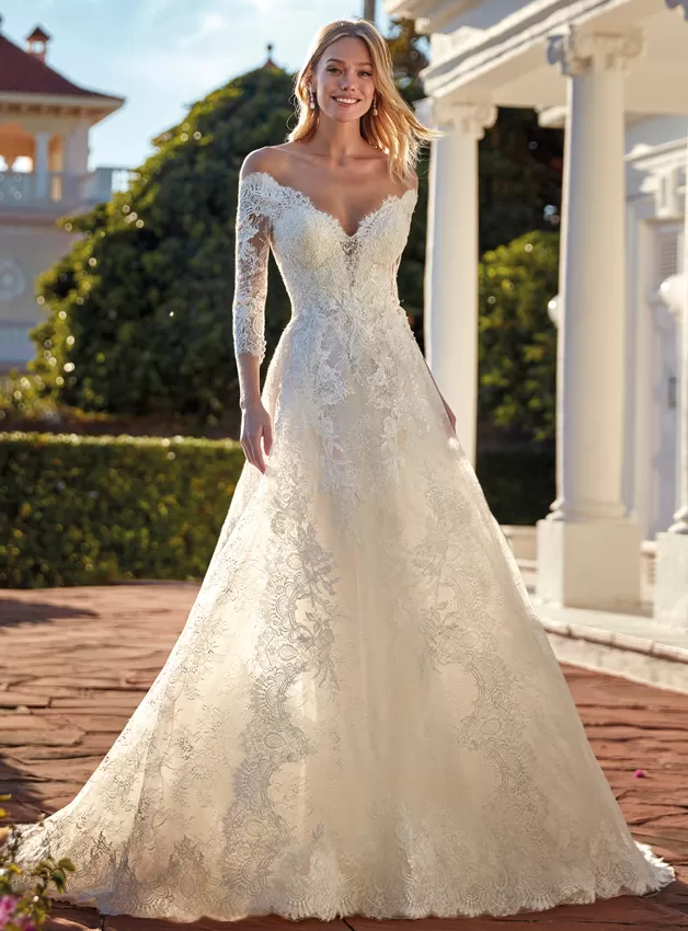 Sofisticato abito A-line in pizzo con un elegante scollo a V off-the-shoulder con maniche a tre quarti. Un modello che gioca con il romanticismo del tessuto e la sensualità delle trasparenze per vestire una sposa davvero molto speciale.