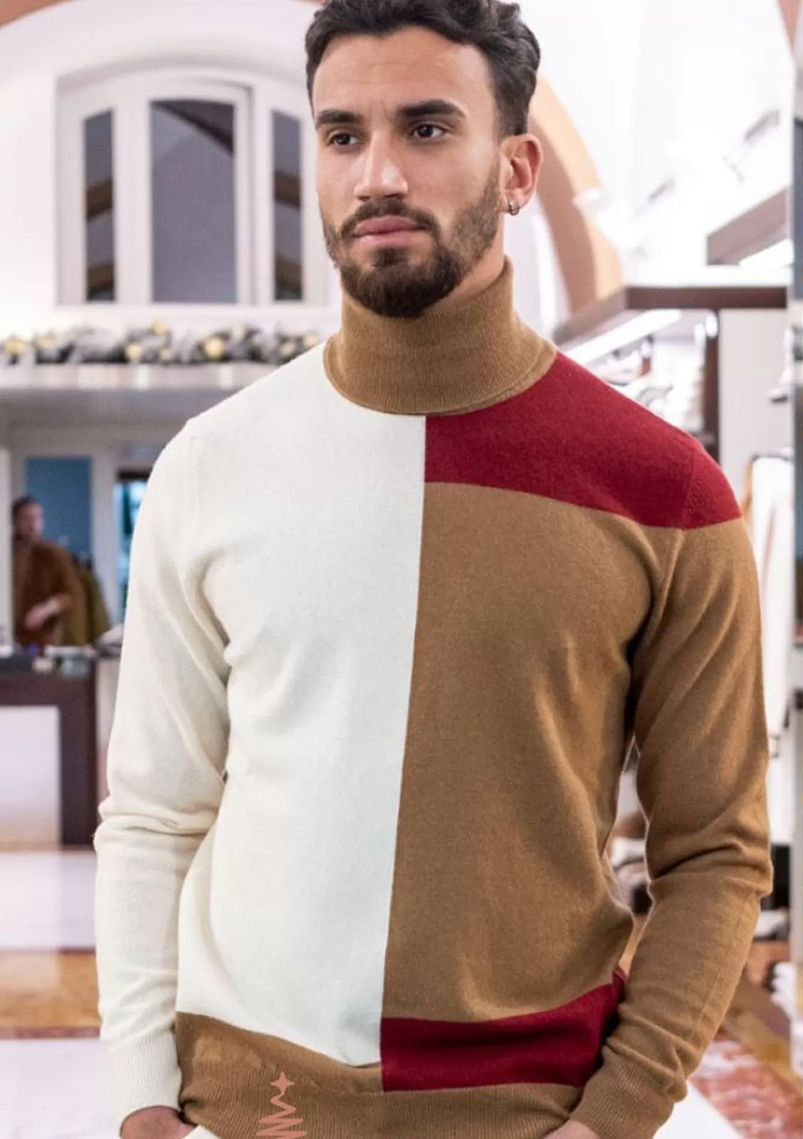 Dolcevita multicolor in panna, cammello e rosso, realizzata in 100% lana. Vestibilità : regular