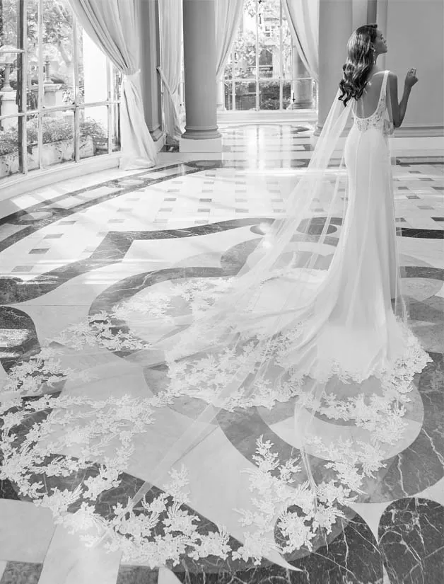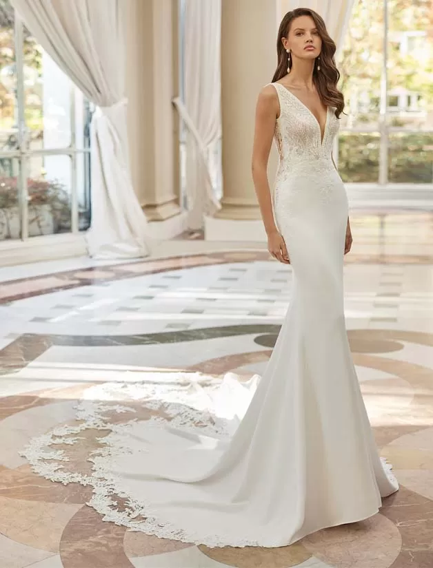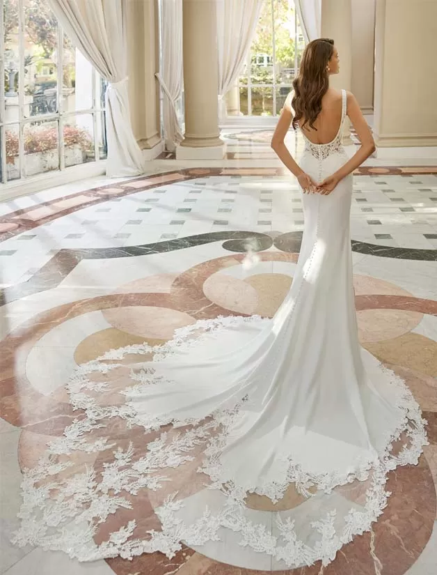 Una cerimonia civile in estate è lo sfondo perfetto per indossare l’abito Alamy. Un modello redingote con scollo profondo sormontato da spalline che incorniciano la schiena scoperta e una gonna in crêpe che culmina in un lungo strascico, rifinita con un motivo di pizzo squisito.
